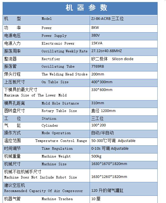 此機裝有高敏度5557防火花保護裝置,可以把模具發(fā)生火花的機率降低95%,對高周波模具和產(chǎn)品起到很大的保護作用。這臺機器可以單人操作,節(jié)約人工成本。它由振嘉機械設(shè)備有限公司專業(yè)制造,機器質(zhì)量已通過歐盟CE質(zhì)量出口檢測和ISO9001機器質(zhì)量檢測;